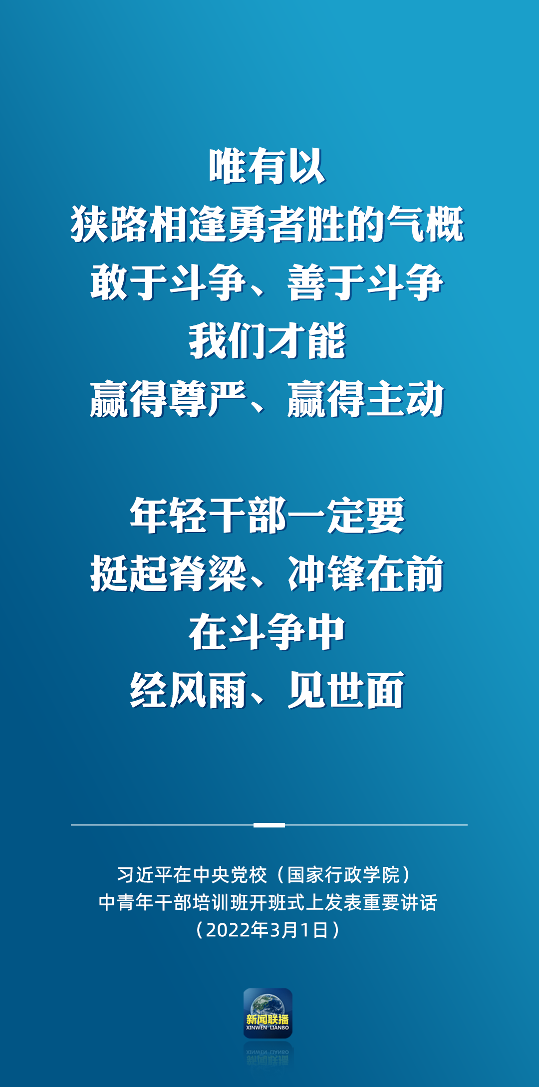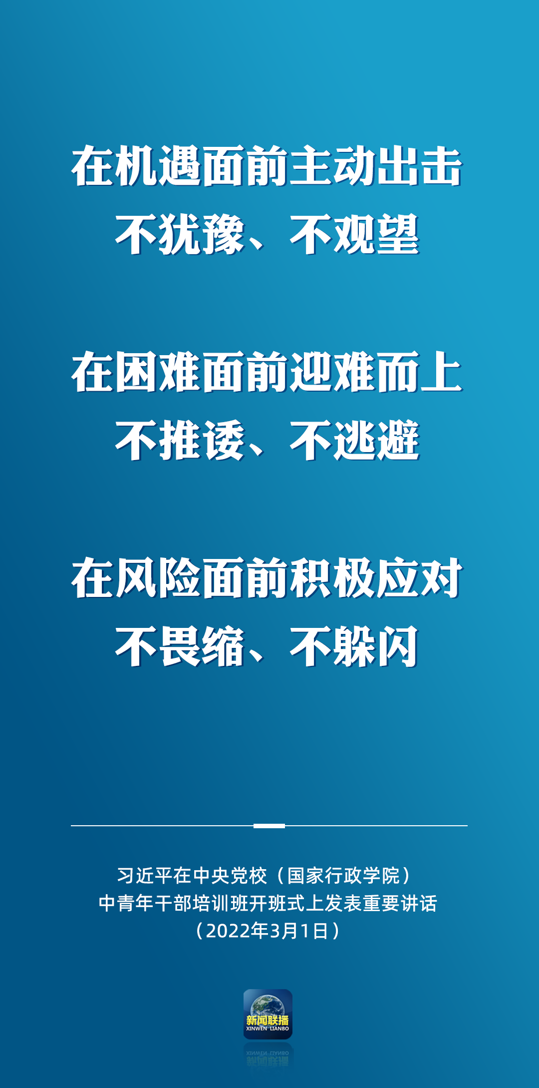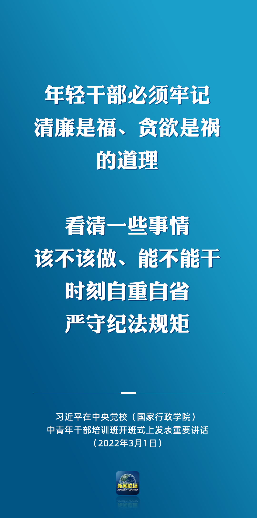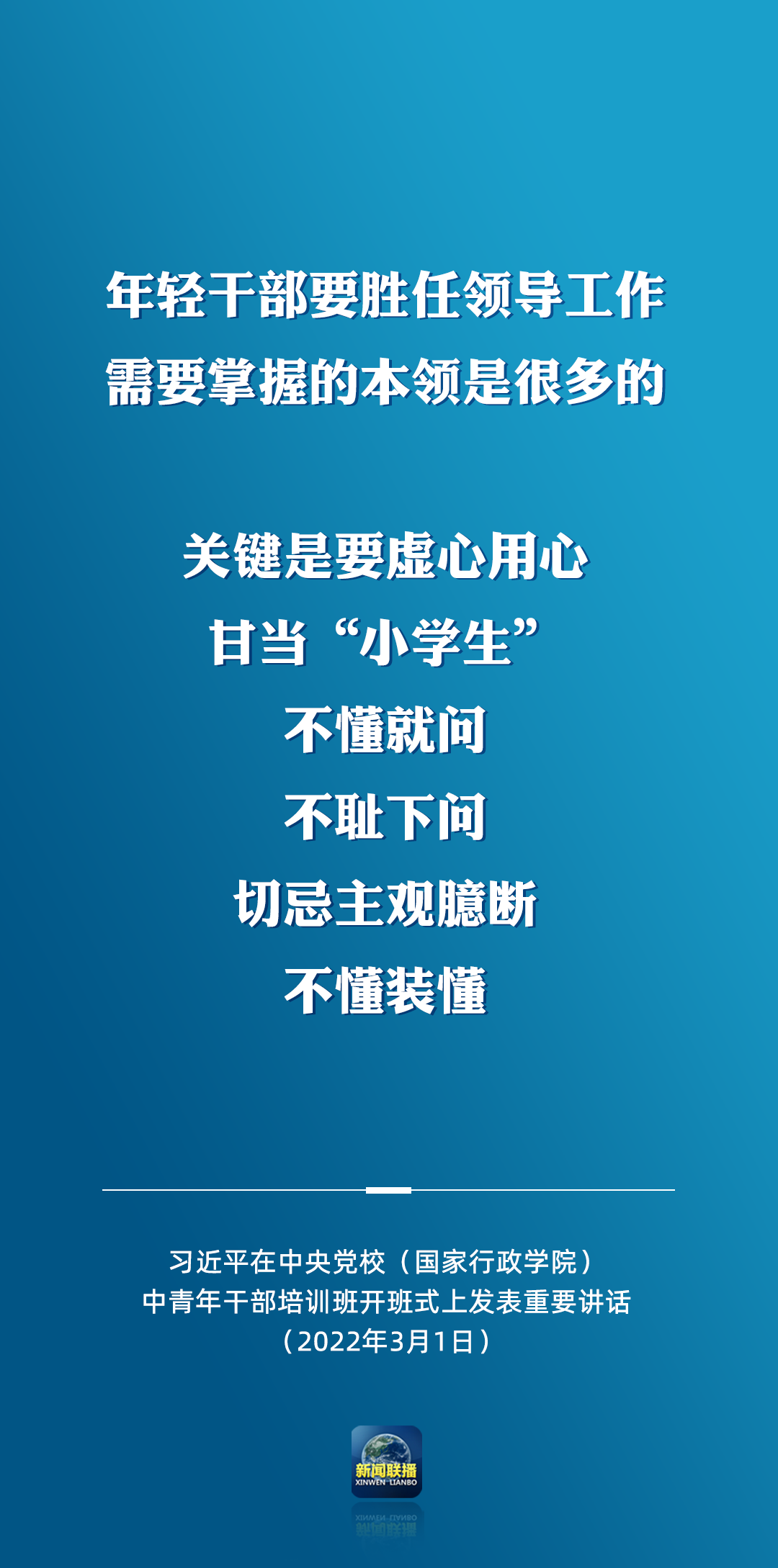 中共中央总书记、国家主席、中央军委主席习近平在开班式上发表重要讲话强调,年轻干部是党和国家事业发展的希望,必须筑牢理想信念根基,守住拒腐防变防线,树立和践行正确政绩观,练就过硬本领,发扬担当和斗争精神,贯彻党的群众路线,锤炼对党忠诚的政治品格,树立不负人民的家国情怀,追求高尚纯粹的思想境界,为党和人民事业拼搏奉献,在新时代新征程上留下无悔的奋斗足迹。