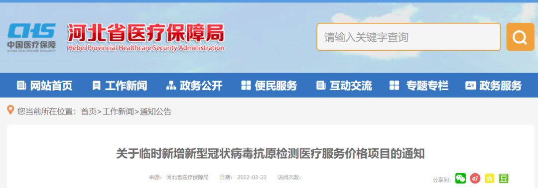 为进一步优化新冠病毒检测策略,服务疫情防控需要,根据国务院通知要求,3月21日,河北省医保局会同河北省卫生健康委印发《关于临时新增新型冠状病毒抗原检测医疗服务价格项目的通知》,新增“新型冠状病毒抗原检测”医疗服务价格项目,并明确收费标准。