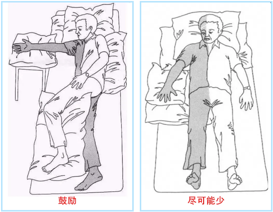 睡姿宜采用侧卧,鼓励患侧卧位,适当健侧卧位,尽可能少采用仰卧位,尽量避免半卧位。同时应注意每隔2小时翻身一次,预防褥疮的发生。