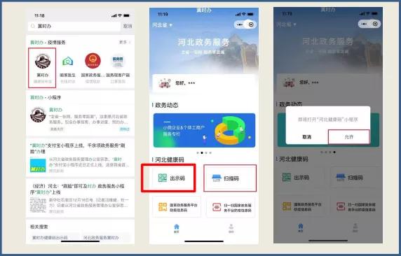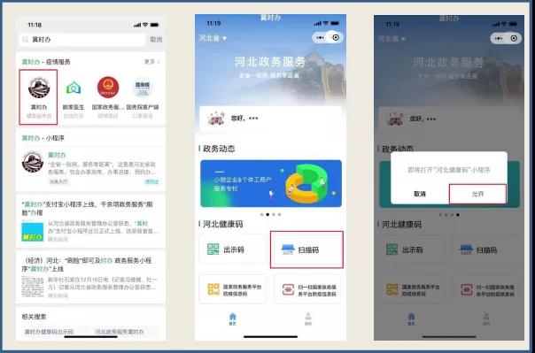 1.微信小程序搜索“冀时办”,点击“扫描码”按钮,打开“河北健康码”。