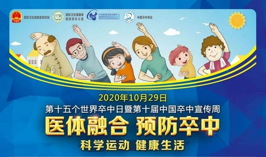 2020年10月29日是第15个“世界卒中日”,主题为“医体融合、预防卒中”,旨在号召公众增加体育运动减少卒中风险,倡导运动与医学防治相结合,更好地防治卒中。