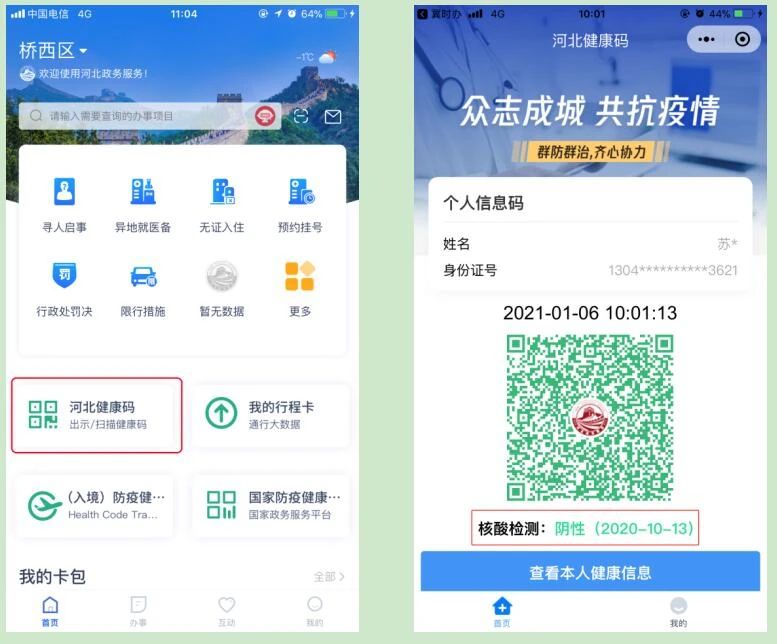目前,有两种比较快捷的方式帮助大家查询到核酸检测结果。第一种是下载并登录 “冀时办”,在蜜桃视频点击“河北健康码”,查看本人健康信息,与健康码同时出现的还有大家的核酸检测结果。