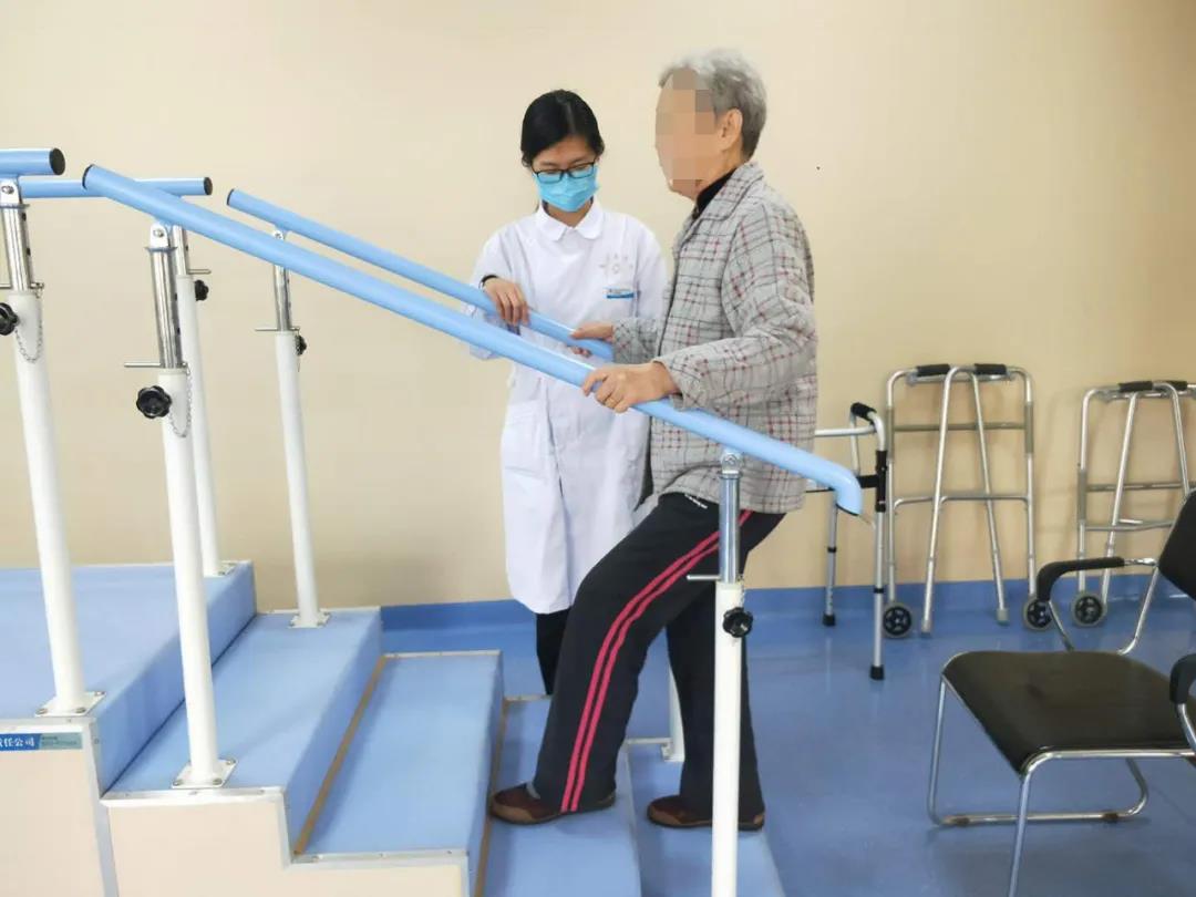 下台阶练习:第一步健手向前扶好;第二步患侧下肢向下迈一个台阶,此时,家属要注意搀扶;第三步健肢迈下台阶,家属在旁要注意防护。