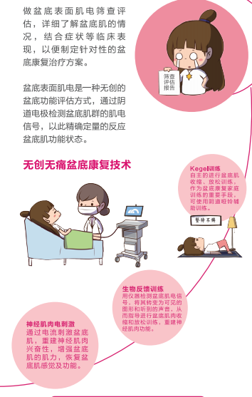 生物反馈训练 用仪器检测盆底肌电信号,将其转变为可见的图形和听到的声音,从而指导盆底肌肉收缩和放松训练,重建神经肌肉功能。