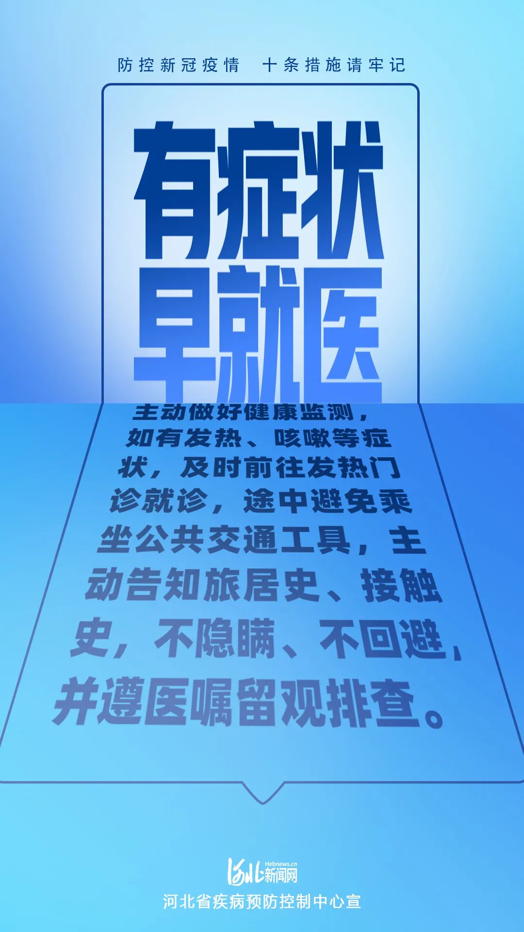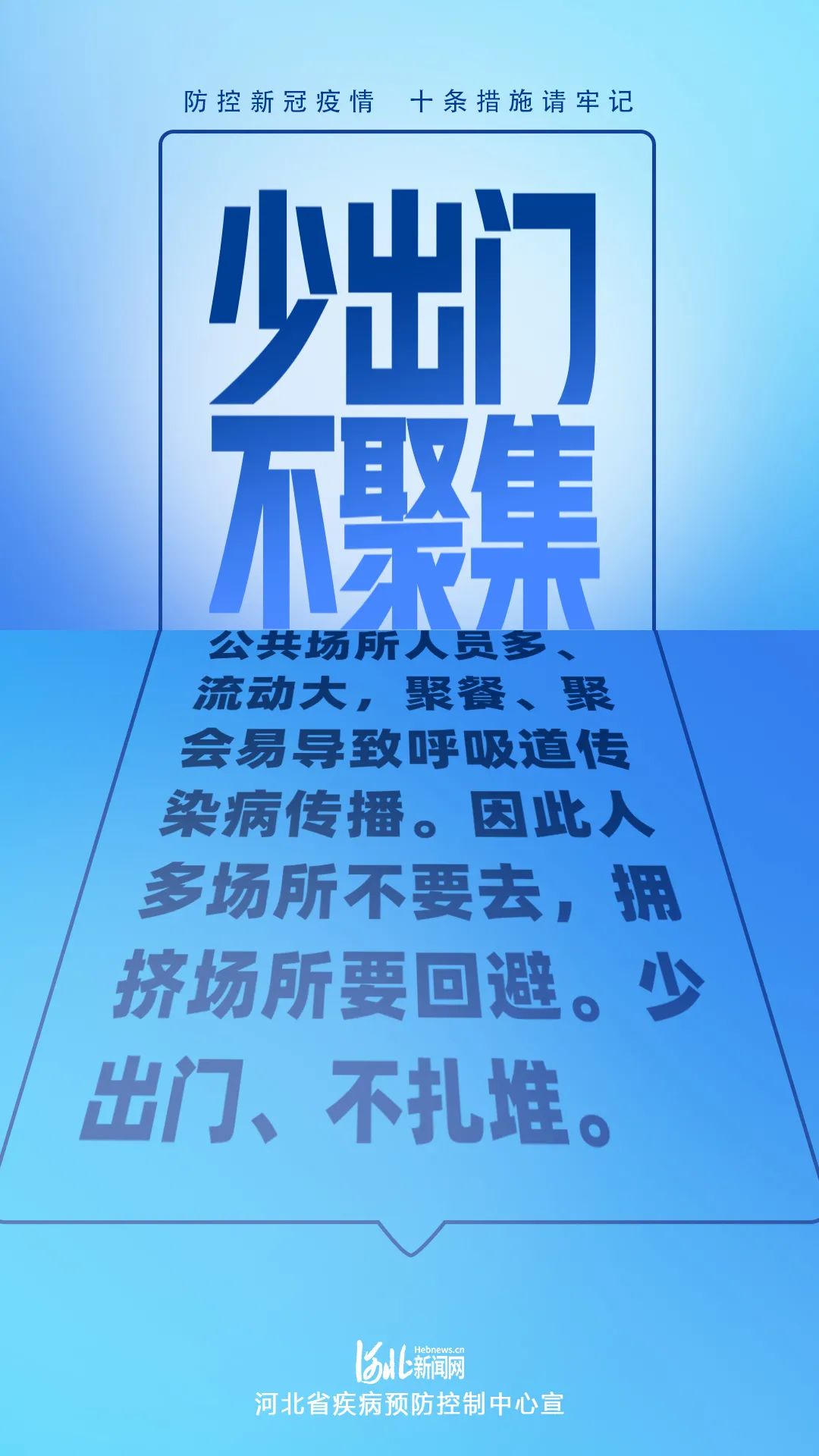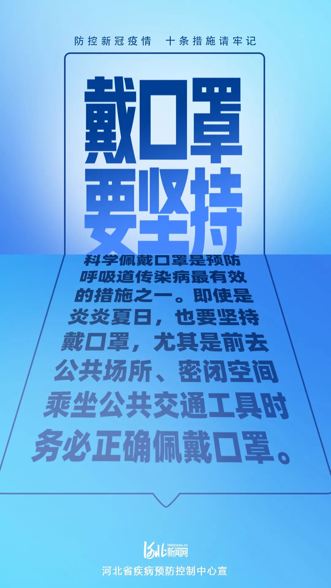 针对当前国内新冠肺炎疫情形势,8月6日,河北省疾病预防控制中心发布防控新冠肺炎疫情十条措施,呼吁公众继续严格做好个人防护及健康监测。