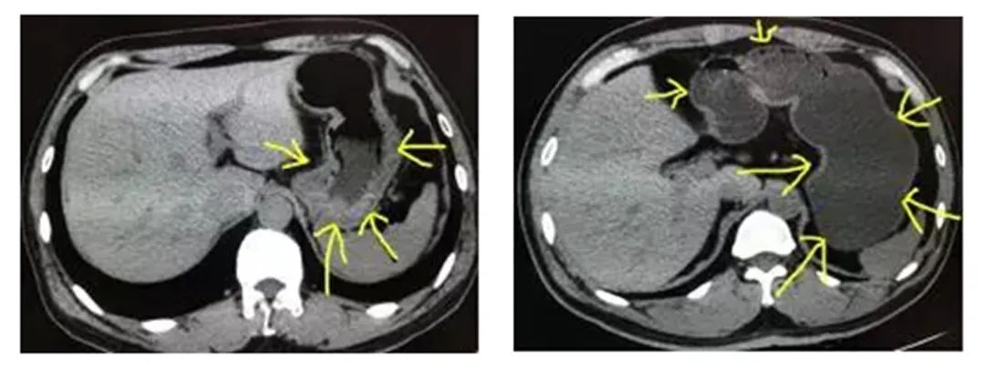 图中黄色箭头指的就是胃,左图是没有喝水,没有充盈好的胃,可以看到箭头指的胃壁明显是厚的,而正常的胃壁也是厚的,如果里面隐藏长着东西,刚好胃壁这里有个小胃癌,那就很可能没办法看清楚,导致漏诊。