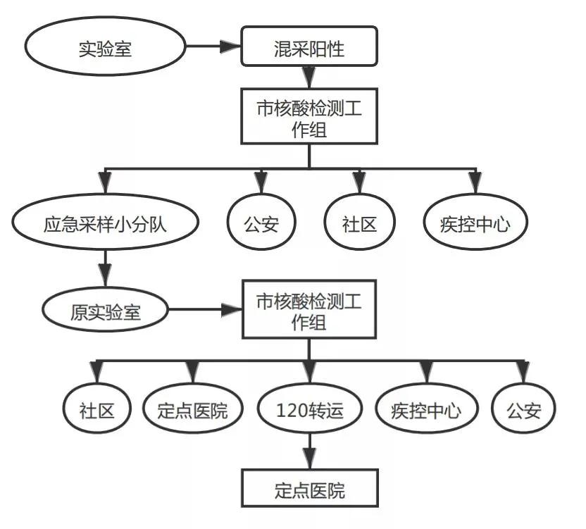 1.单采检测阳性处置流程。单采样本检测结果阳性时,检测机构应当立即上报核酸检测工作组,工作组同时推送2条信息(阳性感染者基本信息、核酸检测阳性报告)至6个部门。一是通知120负压救护车进行阳性感染者转运。二是通知定点医疗机构准备接收该阳性感染者。三是通知阳性感染者所在社区(小区)确认并控制该阳性感染者及与其共同生活居住人员(密接)。四是通知公安机关协助进行阳性感染者转运,并开展该阳性感染者轨迹排查。五是通知疾控中心开展流调、密接排查、研判社区封控范围、疫点终末消毒等工作。六是通知疫情防控指挥部。上述6个部门同时推送、不分先后。
