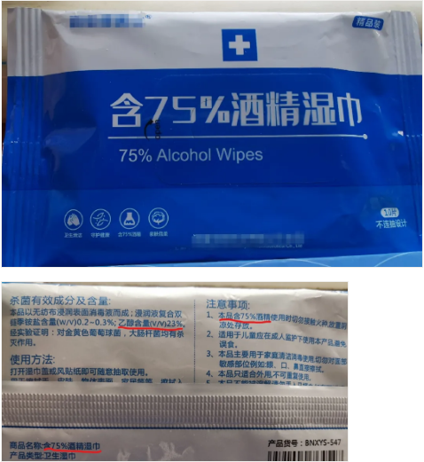 目前由于我国尚未将消毒湿巾列入《消毒产品分类目录》,消毒湿巾不能按消毒产品进行监管,不能办理消毒产品的卫生许可证,也就不能标注消证字号。有些企业将75%酒精湿巾按卫生湿巾上市销售,标签标注内容又普遍存在违规现象,国家《消毒产品标签说明书管理规范》明确规定,卫生湿巾产品禁止标注消毒、灭菌、除菌、高效、无毒、预防、治疗疾病等内容。