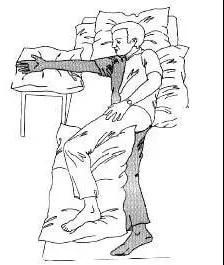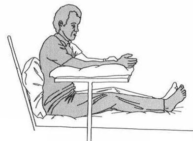 取床上坐位时,背后给予多个软枕垫实,使脊柱伸展,达到直立坐位的姿势,头部无须支持固定,以利于病人主动控制头的活动。患侧上肢抬高,放置于软枕上,有条件的可给予一个横过床的可调节桌子,桌上放一软枕,将患侧肘及前臂放在软枕上,髋关节屈曲近90°。