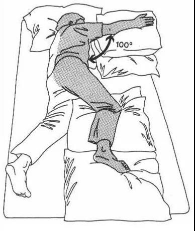 患侧在下,健侧在上,头部垫枕,患臂外展前伸旋后,患侧肩部尽可能前伸以避免受压和后缩,上臂旋后,肘与腕均伸直,掌心向上;患侧下肢轻度屈曲位放在床上,健腿屈髋屈膝向前放于长枕上,健侧上肢放松,放在胸前的枕上或躯干上。