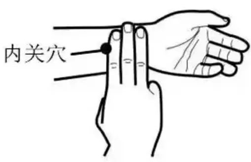 按摩方法:腕横纹上三横指,两筋之间,长按半分钟到一分钟,力度根据自身情况来定。比如按摩左手的,就可以用右手紧握左手臂下端,让这只手的大拇指垂直按在内关穴上,然后用指尖有节奏地按压,可以先按一下,然后揉一揉,接着放松。