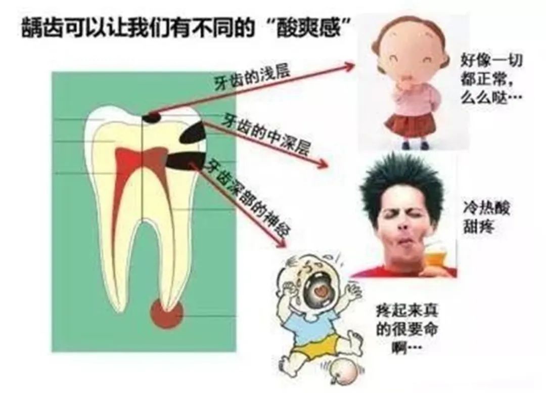 深龋:龋坏已达牙本质深层,一般表现为大而深的龋洞,对外界刺激反应较中龋为重,但刺激源去除后,可立即止痛,无自发性痛。