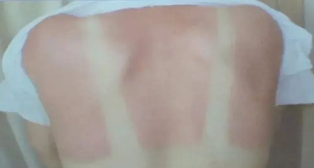 临床表现 日晒伤又称日光性皮炎,常在日晒后30分钟到6小时内出现皮损,24小时达到高峰。表现为日晒部位皮肤出现境界清楚的红斑、水疱,重者糜烂,自觉瘙痒、灼痛;严重者可出现发热、头痛、恶心等全身症状。轻者1-2天消退,严重者约需一周左右恢复。