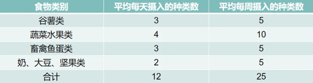 均衡充足的食物是改善患者营养状态的基础,推荐患者每天食物摄入种类达12种以上,每周食物摄入种类达25种以上,包括谷薯类、蔬菜水果类、畜禽肉蛋类、奶大豆坚果类等。