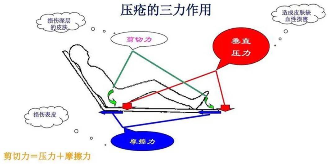局部组织受压过久:老年人因日常生活能力下降或疾病后遗症导致长时间保持一个体位,受压皮肤因身体重力、摩擦力共同作用于身体一个或几个固定受压部位,使得局部组织长期处于缺血、缺氧状态,造成局部皮肤红斑、组织坏死、溃疡形成,这是压疮发生的最主要原因。