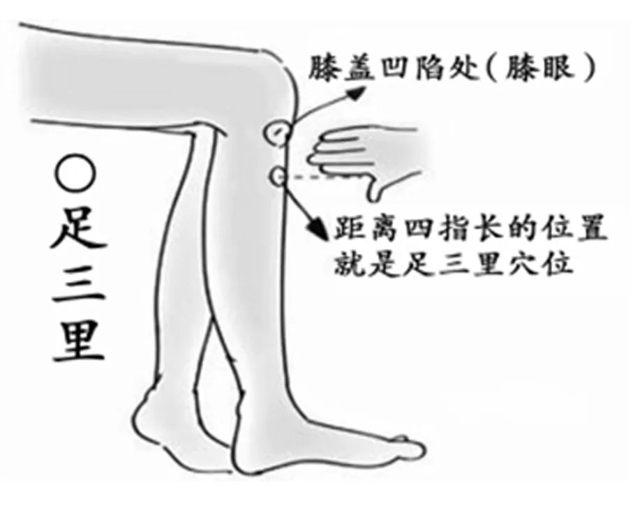 足三里穴 位于小腿前外侧,外膝眼下4指宽,距胫骨前缘一横指。