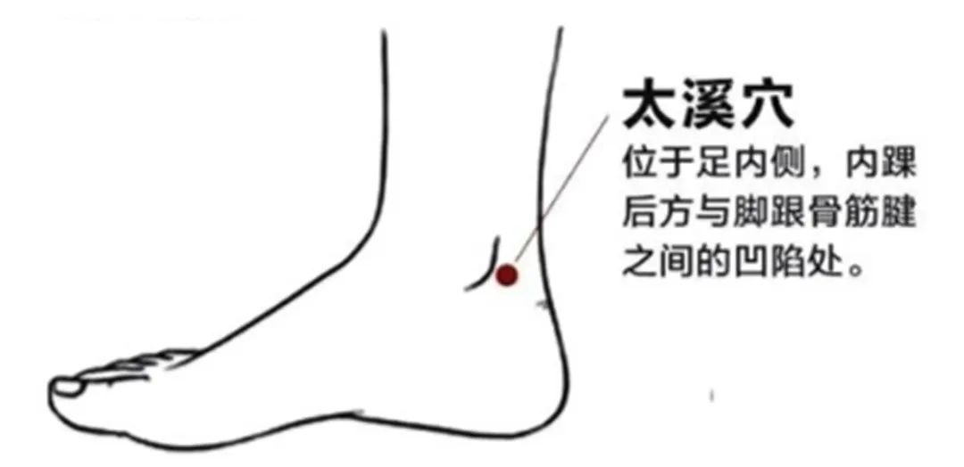太溪穴 位于足内侧,内踝后方,当内踝尖与跟腱之间的凹陷处。