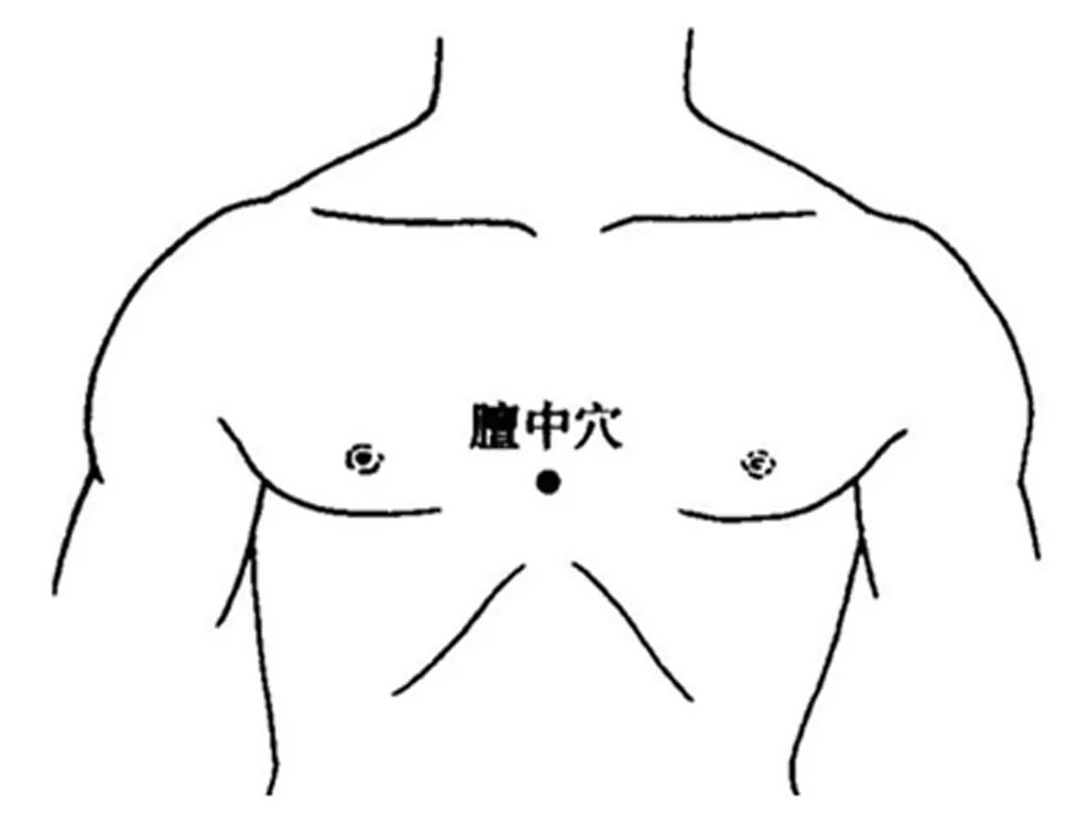 膻中穴位于任脉,在两乳头之间,胸骨中线上,平第四肋间隙,能理气止痛、生津增液。
