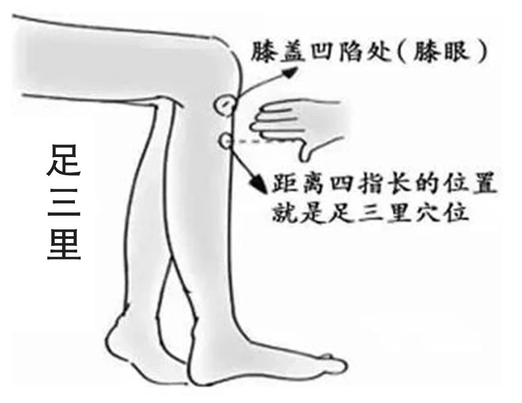 足三里穴位于小腿外侧,外膝眼下三寸,胫骨旁开一横指。是足阳明胃经的腧穴,也是其下合穴,又是四总穴之一。作用多,治疗范围广,故而称之为“强壮保健第一要穴”。