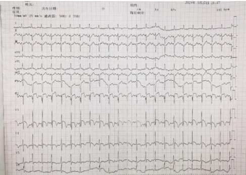 患者李先生,59岁。因急性大面积脑梗死溶栓治疗后由外院转至全科医疗/肿瘤内科。入院后,患者突然出现剧烈胸痛、大汗,紧急检查发现,心电图示V1-3ST段广泛弓背抬高,肌钙蛋白9.6ng/ml,肾功能肌酐443ummol/L。