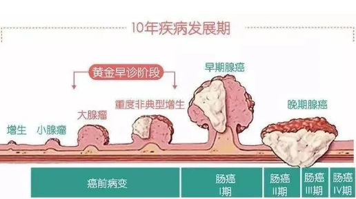研究发现,有80~95%的结直肠癌由结直肠息肉演变而来,经历从正常黏膜→增生→腺瘤形成→腺瘤癌变的过程,这个过程一般需要5~10年的时间。