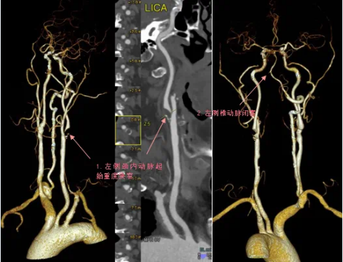 70岁的程爷爷,突然出现右侧肢体无力,右上肢勉强抬举,右下肢不能撑重,还有口角歪斜症状,到蜜桃视频-麻豆蜜桃 就诊检查,医生了解病情后,随即为老人开具了头颈部CTA检查,检查结果显示程爷爷的左侧颈内动脉起始部重度狭窄,几近闭塞;左侧椎动脉重度狭窄,局部闭塞。