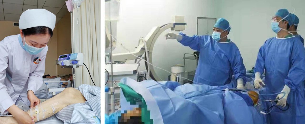 左:骨一科护士为老年患者做下肢留置针静脉穿刺