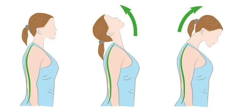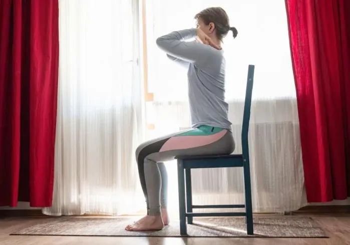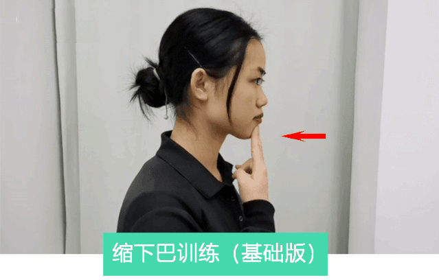可明显感觉到脖子后面的伸展。坐在椅子上,肩胛骨后缩,头挺直,将下巴缩回,就像做双下巴一样,保持这个姿势5到10秒,同时感觉颈部的伸展,放松回到初始位置。重复5次。
