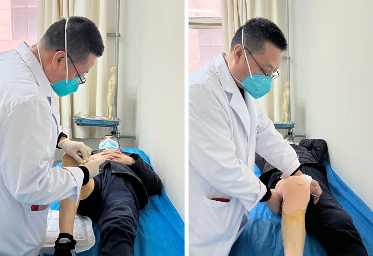疼痛科主任代洪燕为王爷爷进行神经阻滞治疗,在膝关节周围神经及组织进行药物注射,消炎镇痛、消除神经水肿和组织循环障碍,调节神经功能传导,老人疼痛得到了有效缓解。