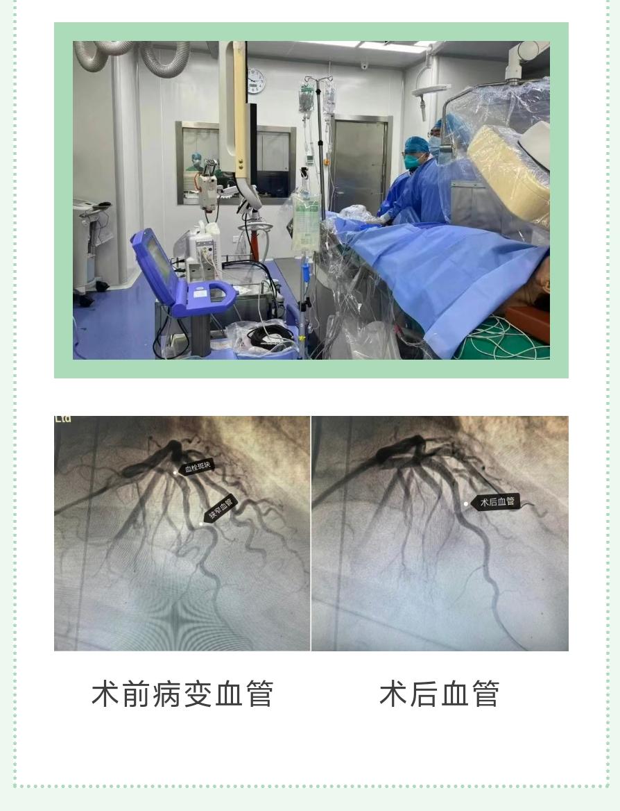 患者冠脉造影提示前降支近段可见血栓存在,狭窄最重约99%,中段可见弥漫性狭窄病变,狭窄最重约90%,在为张先生实施了冠状动脉血栓抽吸术及冠状动脉球囊扩张成形术后,复查造影显示前降支近中段病变处理效果良好,从而在前降支病变处串联植入3枚支架,为患者开通了生命通道。