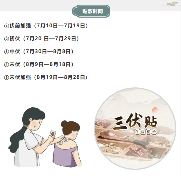 中西医结合科连续多年开展三伏贴治疗,每年伏天进行冬病夏治三伏贴的患者络绎不绝,三伏贴治疗通过药物和节气以及人体经络的多重元素的结合,对人体的健康的调理及疾病的向愈起到了很好的作用。今年中西医结合科冬病夏治三伏贴贴穴时间如下: