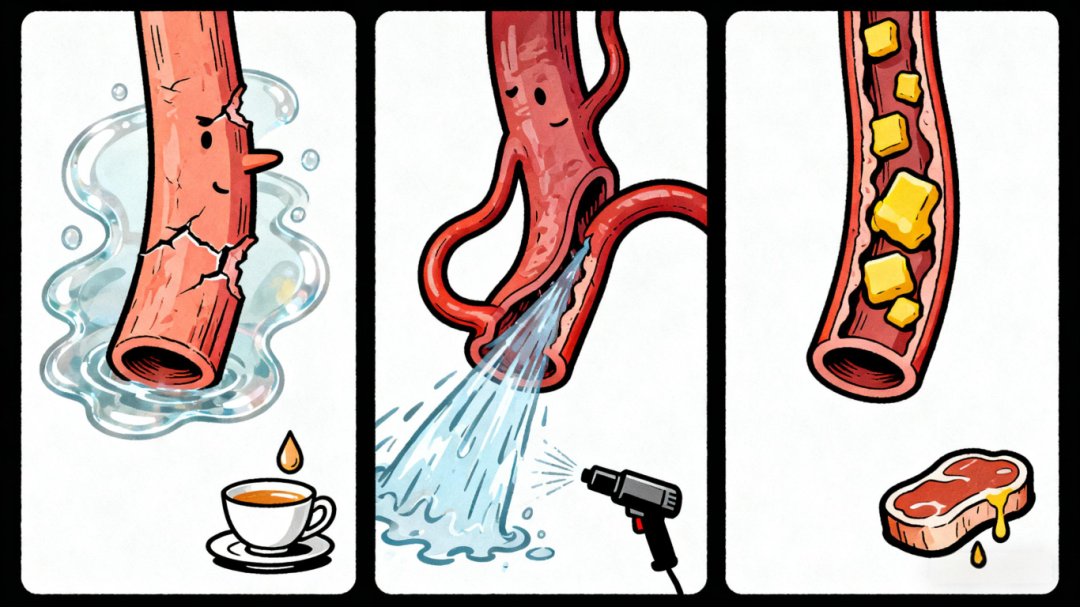 血液里的“油”太多(如胆固醇),会像水垢一样沉积在血管内,形成粥样斑块,让血管越来越窄。