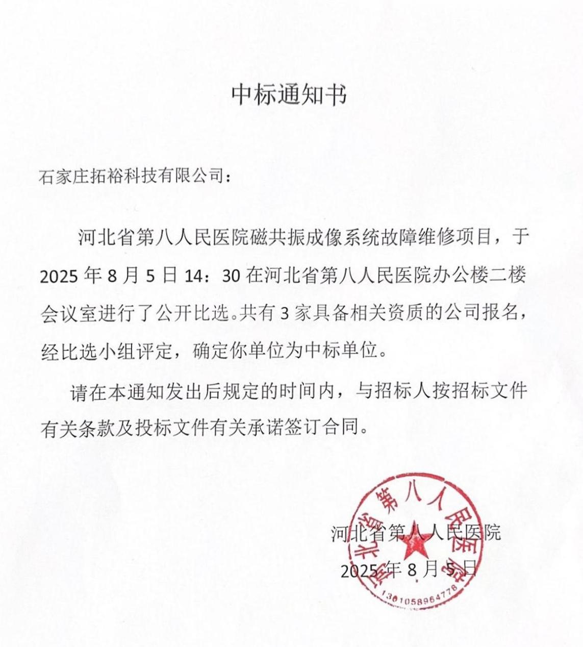 蜜桃视频 磁共振成像系统故障维修项目中标公告