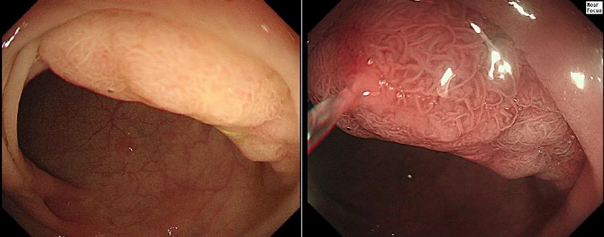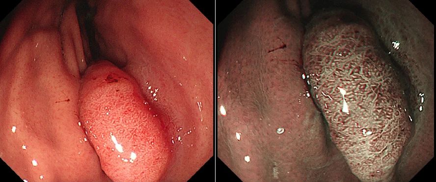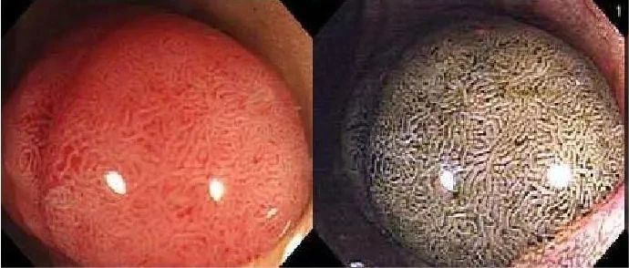 左:普通内镜 右:NBI