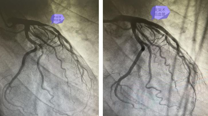 为患者行急诊PCI手术,冠脉造影术检查显示,前降支近中远段可见弥漫性狭窄,近中段可见血栓影存在,狭窄最重约95%,远段狭窄最重约40%,结合患者心电图表现,考虑前降支为本次发病罪犯血管,经评估后为患者行冠状动脉血栓抽吸术,回抽可见血栓存在,血栓抽吸完毕后顺利为患者在病变处串联植入支架2枚,复查造影结果显示支架贴壁良好,未见明显贴壁不良。