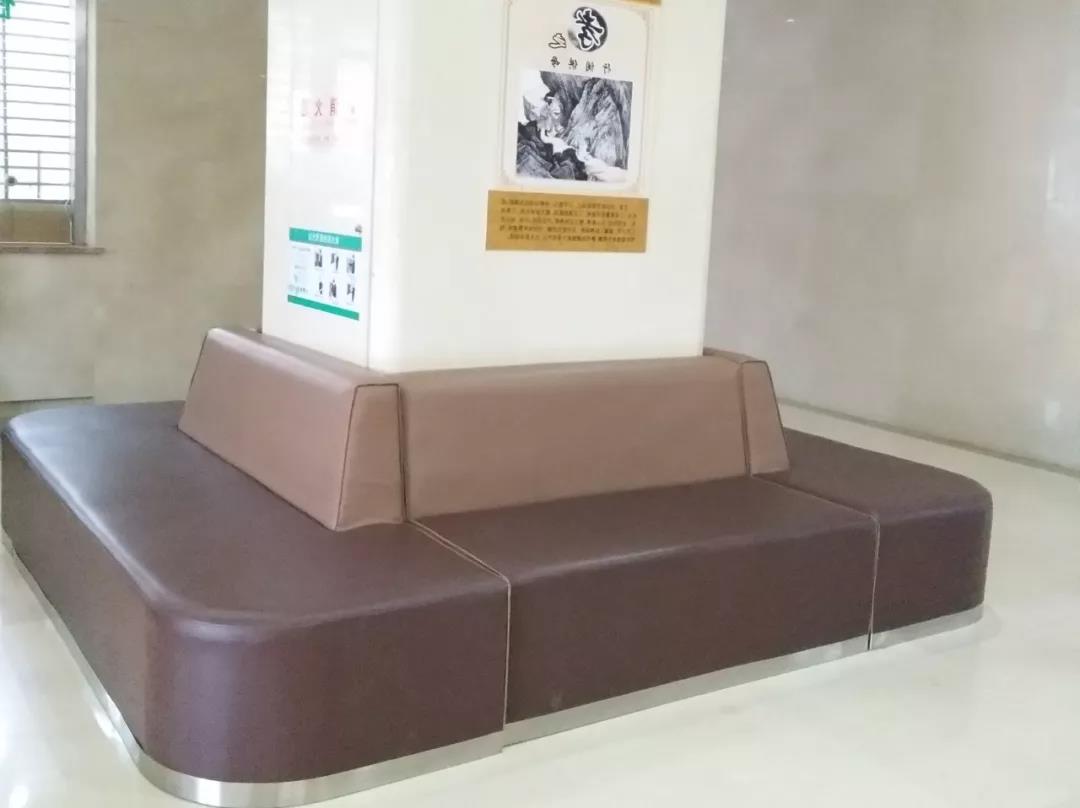 遍布门诊大厅的无角皮质沙发,舒适安全,方便老人随时坐下休息。