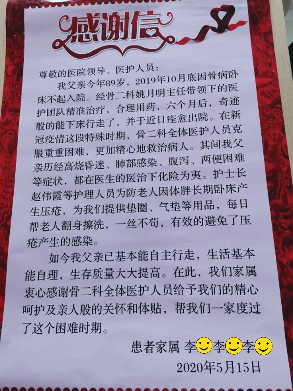 “老人不用天天躺床上了,也解决了老人出院在家护理的一大难题,我们受老人之托,给你们送来锦旗和表扬信,谢谢你们!”前几天,李爷爷的家人在他出院后再次来到蜜桃视频 ,送来了锦旗和表扬信,“医德双馨、情系患者 、白衣天使、精心呵护”,简短的四句话,表达了一家人对骨二科全体医护人员的深深谢意。