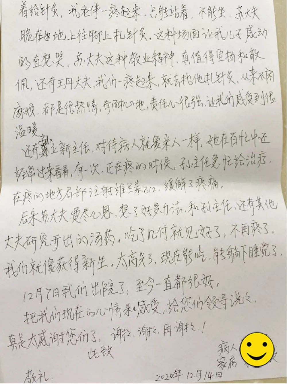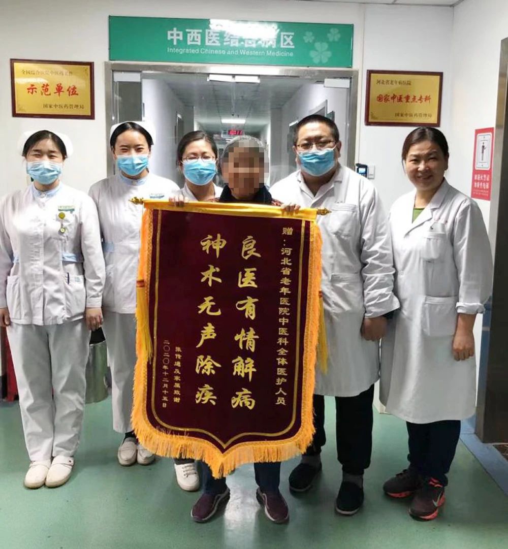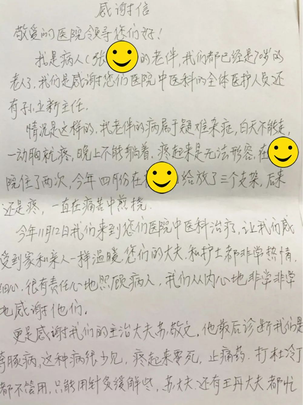 为了感谢中西医结合科医护人员的精心医治和优质服务,张大爷和老伴儿特意写了一封情真意切的感谢信,还送来一面精心制作的锦旗,赞扬“良医有情解病、神术无声除疾”。