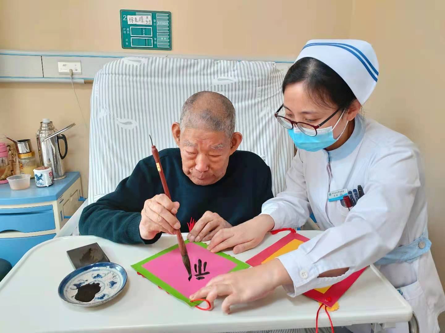 右:内分泌消化科医护人员向住院治疗的抗美援朝老英雄送上新春祝福