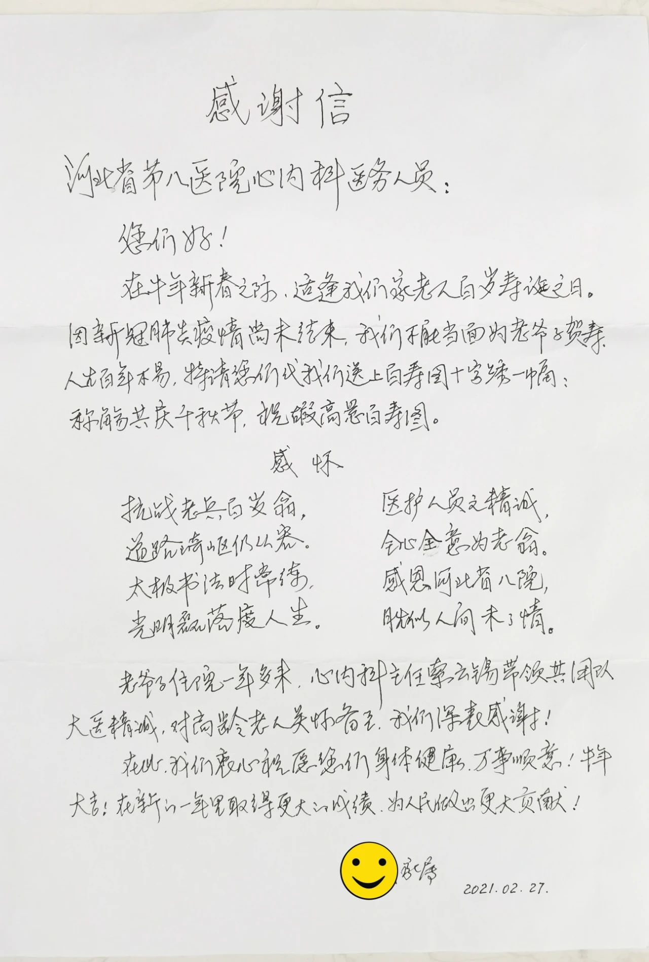 2月28日清晨,蜜桃视频-麻豆蜜桃 心内二科病区医护人员正在井然有序忙碌着,电话铃声响起,原来是10床王爷爷的家属打来的:“今天是我们家老爷子的百岁寿诞日,疫情防控有要求,我们做儿女的不能到蜜桃视频 给老爷子当面贺寿了,我们给老人准备了一幅百寿图十字绣,放在导医台了,烦请你们转给老人。还有一封感谢信,感谢医护人员对老人的悉心照料,谢谢了!”