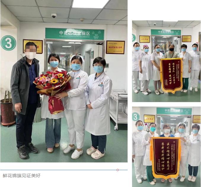 王爷爷是位年过八旬的老人,患有高血压、脑血管病、冠心病等,十几年来,身体一有不适,就到我们科治疗、调理,每次来,我们都开玩笑叫他“八零后”,经过我们定期随访、综合治疗,老人身体各项指标都很好,他经常和我们说,我这身体就交给你们了,这不叫着叫着就成了“九零后”,我还要当“零零后”呢……后来,王爷爷的老伴儿到我们科住院治疗,经过全面检查,诊断为肺部恶性肿瘤。孙立新主任和王爷爷反复沟通交流,决定在我们科做保守治疗。孙主任为老人制订中西医结合综合治疗方案,经过抗癌扶正、营养支持、心理疏导等综合治疗,老人病情逐渐好转,进食增多,肺占位合并感染控制良好,精神状态明显好转。王爷爷和子女常说,中西医结合科的医护人员不仅做到了治病救人,还让老人活得“有希望”、“有勇气”,活的“更美好”。