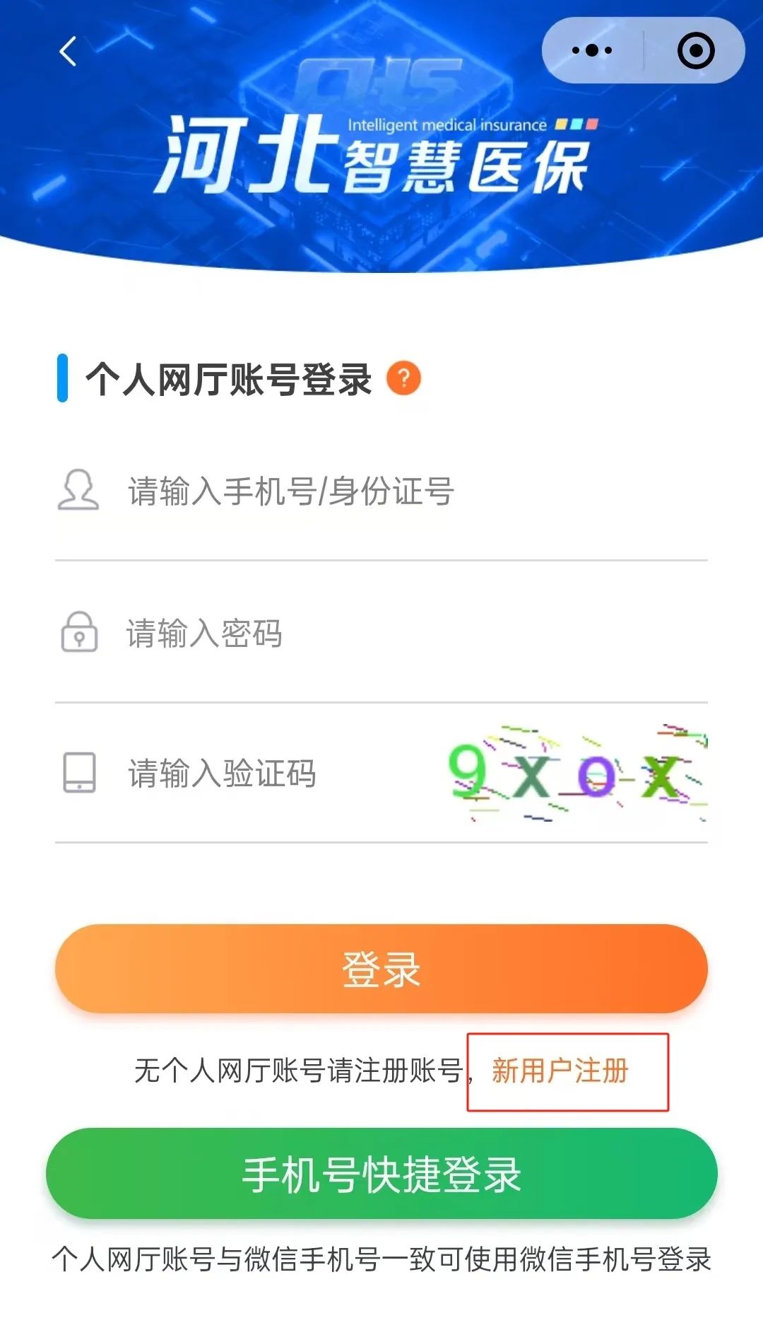 1.打开小程序“河北智慧医保”,登录账号或新用户注册。