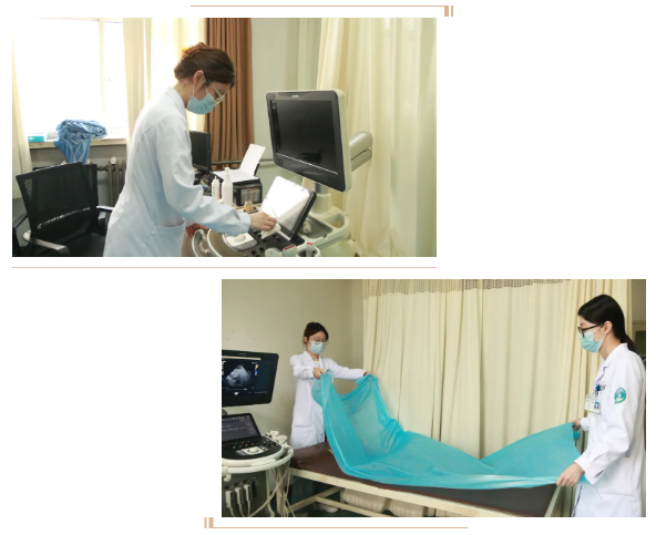 在检查室里,科室人员每天做好环境卫生及消毒工作。仪器定期用消毒湿巾擦拭、清洁,定期做紫外线消毒,每日更换床单,实行“一室一患”,诊室安装布帘以保护检查者隐私,在床尾铺上塑料垫,减少检查者穿脱鞋子。此外还增置衣物挂钩、椅子等便民设施,努力为患者提供干净温馨的就医环境。