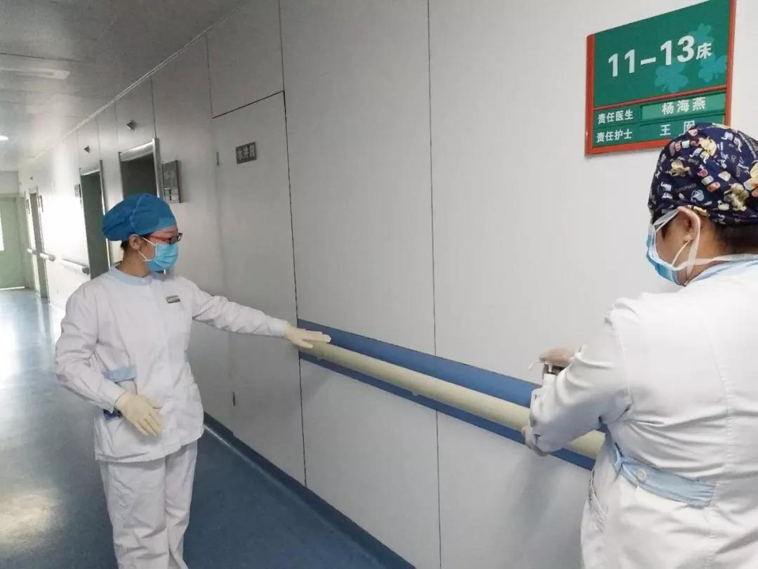 病区住院患者多为老年人,是新冠肺炎的易感人群,加强病区防控工作非常重要。护士长刘爽每天带领护士严格按照流程规范对病区消毒,楼道扶手、门把手、电梯按键,每一个细节都不会放过。