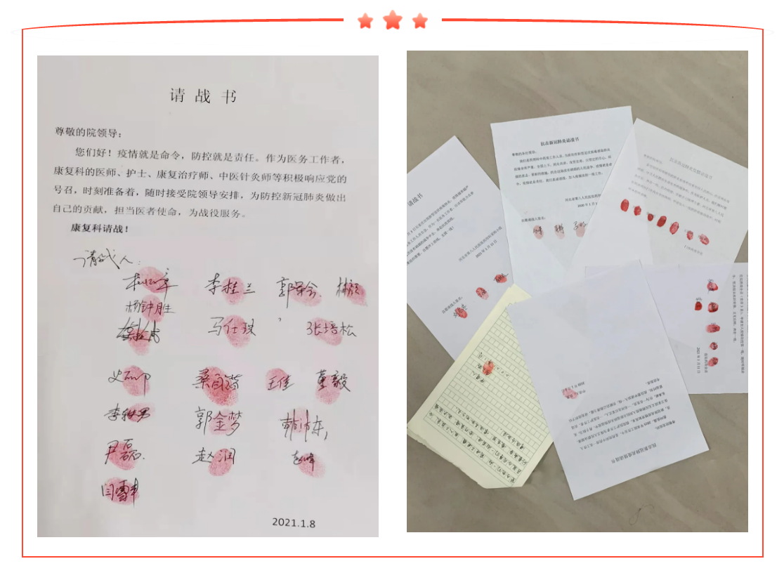 疫情发生以来,康复医学科、药剂科全体工作人员第一时间递交请战书,要求到战“疫”最艰苦的地方去。