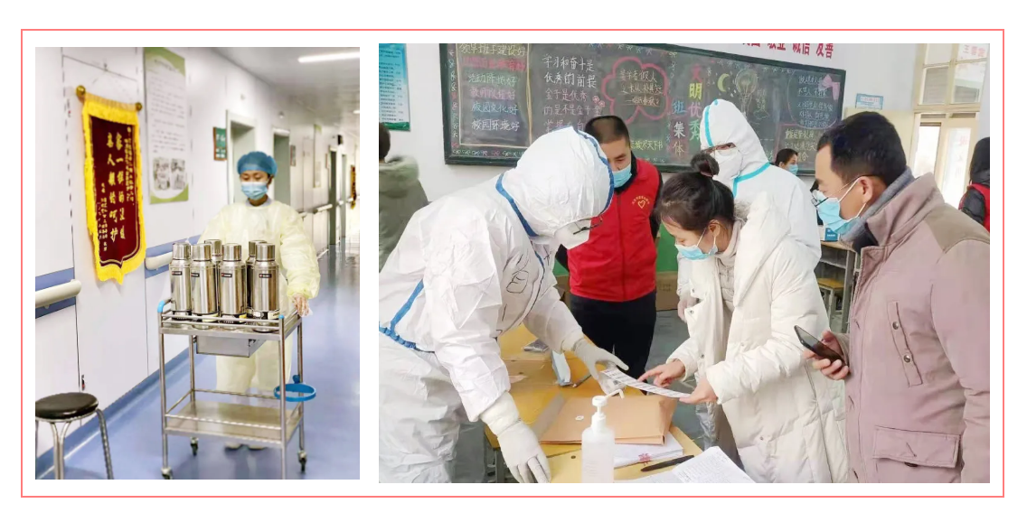 左:赵伟霞为留观战友做好生活服务 右:在元氏县核酸采集现场