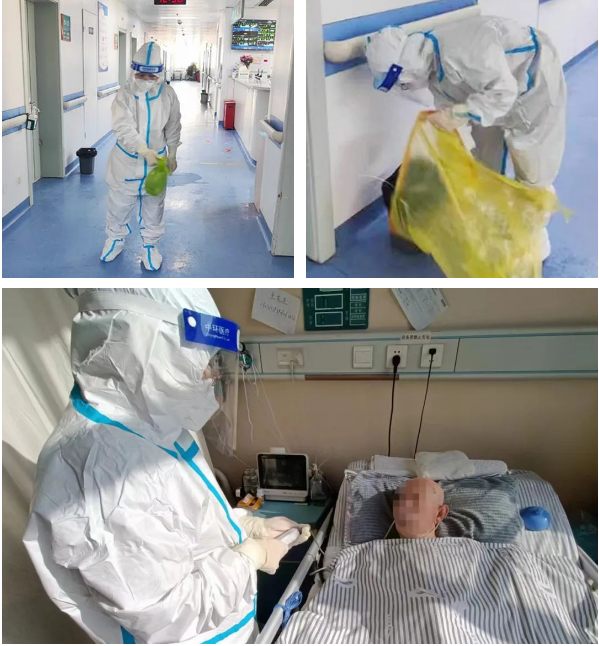除了做好日常治疗护理工作和病区核酸采样、环境消杀等,患者的后勤保障也是重中之重,患者和家属的三餐、生活用品由专人送达后,再由病区医护人员发放。特殊时期,病区保洁员因病暂时缺岗,医生、护士立即担负起“临时保洁员”工作,每天早上6点,打扫病区卫生,打包垃圾并做好垃圾的回收,做完这些,又立即投入到忙碌的诊疗护理工作中。