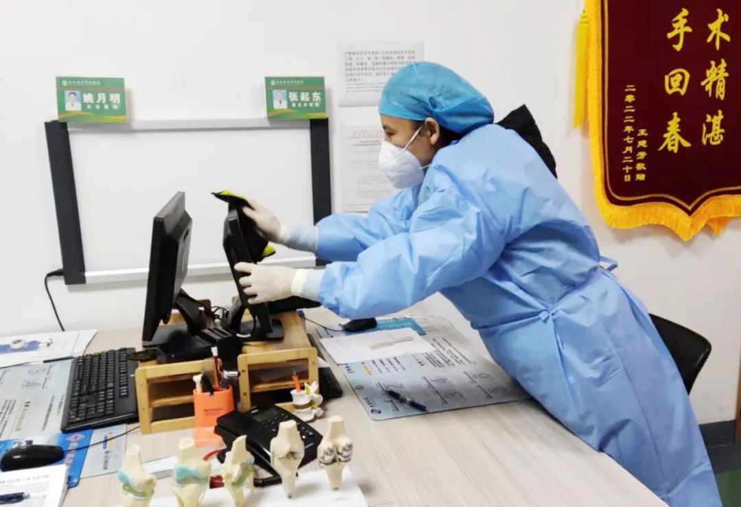 病毒肆虐,天寒地冻。护理部副主任李静带领护理部全员前往门诊楼进行彻底消杀。从消毒液的正确配置到空气、物表、地面消毒,都严格把关,确保次日清晨门诊能够正常接诊。在封控科室的病房里、晨会交班中,李静都会认真督导防护服穿戴情况,把关病区消杀次数和效果,指导各病区改变疫情期间排班模式,叮嘱大家有计划储备防护物资,在护理团队这个战斗集体中,她既是指挥员,又是战斗员。