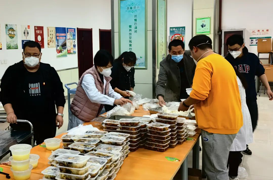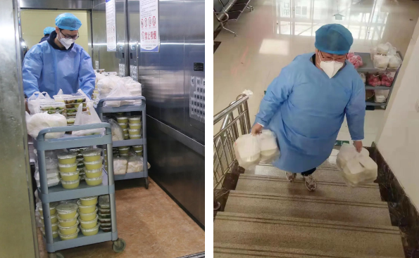 蜜桃视频 封闭管理期间,食堂采购人员克服货源不足、送货困难等问题,多方采购食品,保证院内食堂供应。食堂工作量大,工作人员不足,副院长栗爱珍带领行政人员轮流在食堂帮忙,为全院病区送餐。门诊病区封闭无法使用电梯,送餐人员就走楼梯为患者和医护人员送餐。每日三餐,百余份饭菜,送餐人员要在楼层间折返数十次,他们顾不上腰酸腿痛,也顾不得汗水浸透了衣衫,心中只有一个愿望,就是让奋战在一线的医护人员和患者吃上暖暖的饭菜。
