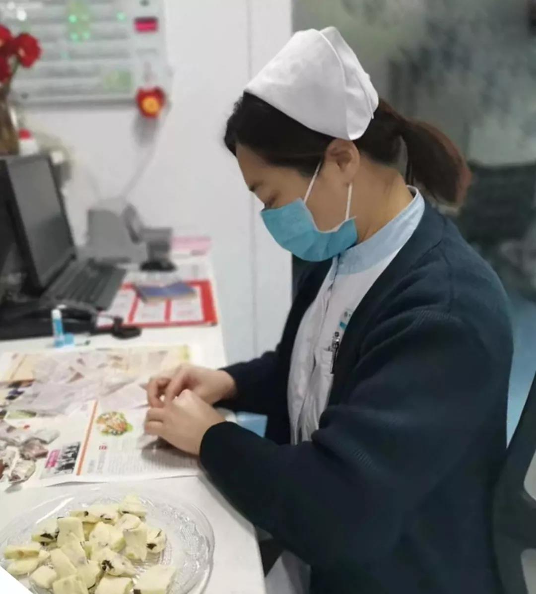 新年的祝福,有饺子,还有必备的“水果茶歇”。骨二科护士长赵伟霞把自己在家里精心制作的“幸福”牌牛轧糖带过来,科里的护理人员打好包装,送到每位患者手中。